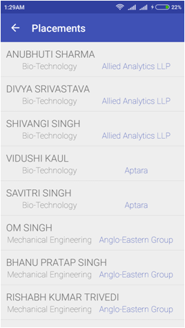 Placement: This section shows the placement details of student of IMSEC. It shows name of student associated with name of the company in which they have placed.
